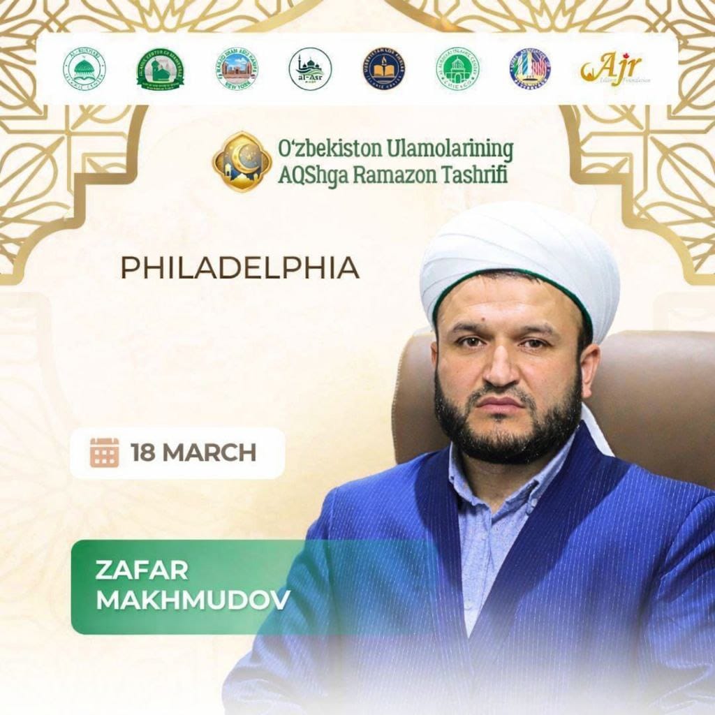Азиз диндoшлар, қадрли ватандошлар!Сизларни 18-март, чоршанба куни бўлиб ўтадиган муборак диний учрашув ва Хатмонага самимий таклиф этамиз. Ушбу хайрли тадбирда Самарқанд шаҳрининг имом-хатиби, ҳурматли Зафар Ҳожи Махмудов меҳмон сифатида иштирок этадилар.Бу файзли кечада биргаликда дуо қилиб, Қуръон тиловатларини тинглаб, қалбларимизни нурга тўлдириш, ўзаро меҳр-оқибат ва бирдамлик муҳитини янада мустаҳкамлаш имконига эга бўламиз. Барчангизни ушбу савобли ва маънавий бой учрашувда фаол қатнашишга чорлаймиз.Аллоҳ таоло қилган хайрли ниятларимизни қабул қилсин, жамиятимизга тинчлик, барака ва бирлик ато этсин.Манзил: 13454 Trevose Road, Philadelphia, PA 19116