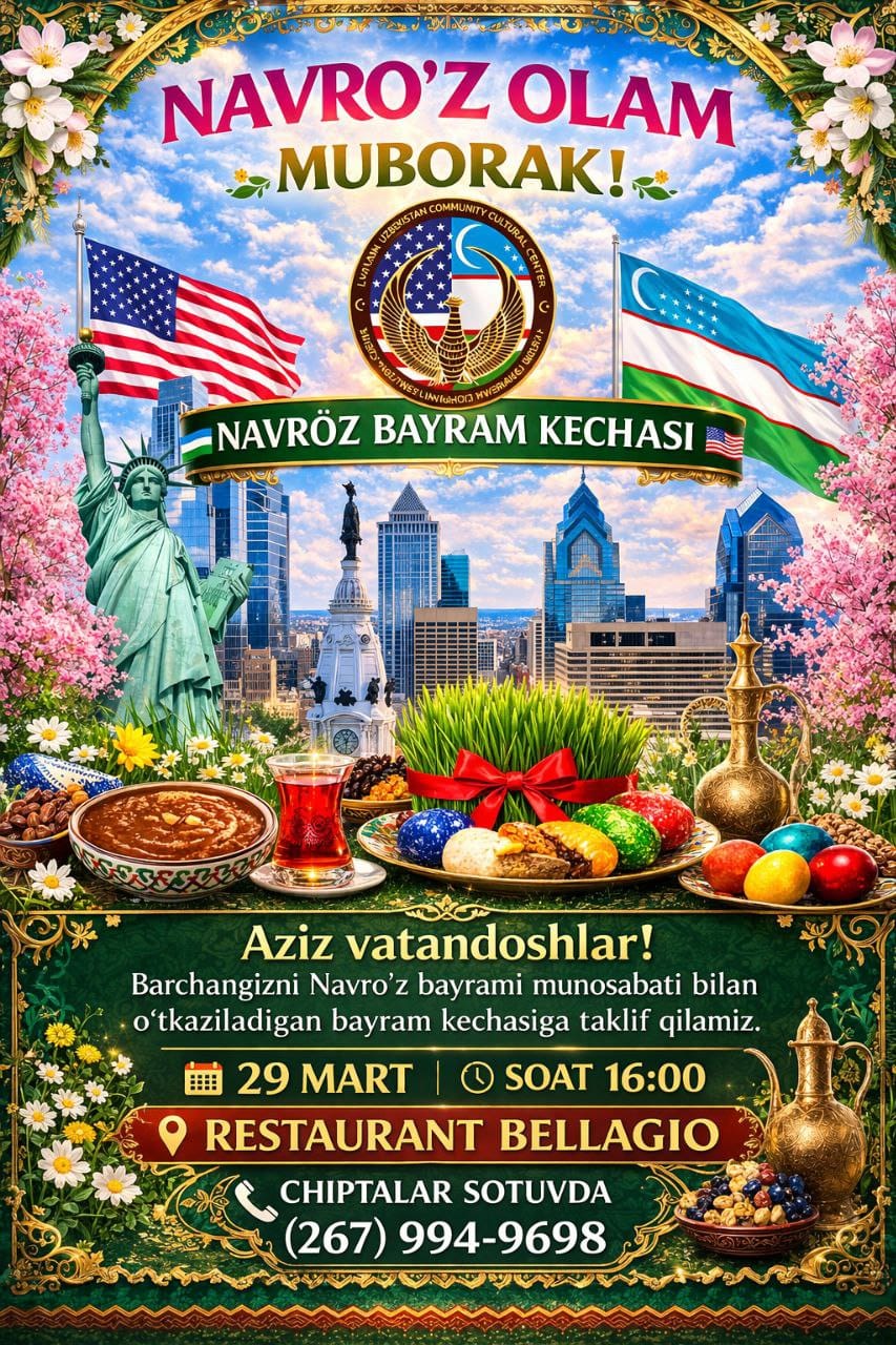 Азиз ватандошлар!Кеча Uzbekistan Airways компаниясининг вакиллари ҳамда Филаделфиядаги Ватан жамияти фаоллари иштирокида муҳим учрашув бўлиб ўтди.Учрашув давомида ватандошларимизнинг манфаатларини кўзлаб қатор таклиф ва мулоҳазалар муҳокама қилинди. Жумладан:Ўзбекистонга ҳар кунлик рейслар ташкил этиш режалариАвиачипталар нархларини арзонлаштириш масаласиЯқин келажакда Филаделфиядан Ўзбекистонга бевосита рейс очишАмерикадан тўғридан-тўғри Самарқанд шаҳрига парвозлар йўлга қўйиш ташаббусиУчрашув жуда фойдали, мазмунли ва амалий руҳда ўтди. Келгусида бу каби мулоқотлар ватандошларимиз учун янада қулай имкониятлар яратишига ишонамиз.