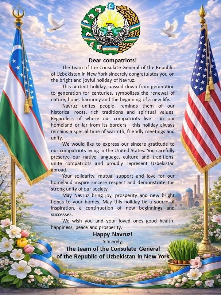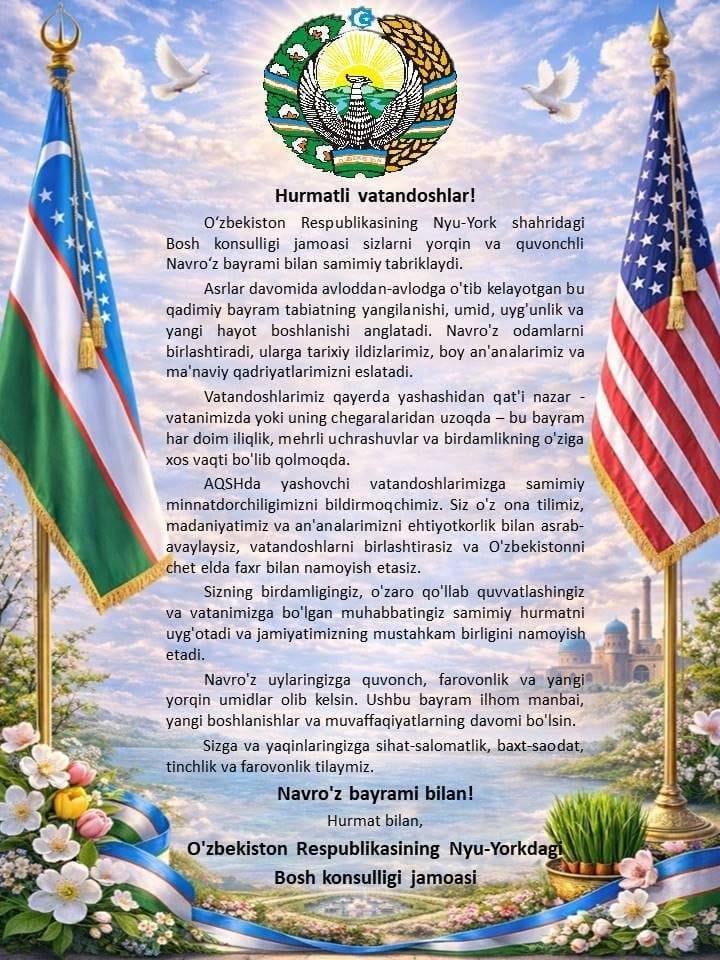 Ватандошимизга тўйлар муборак бўлсин!Янги оилага бахт, саодат, муҳаббат ва тотувлик тилаймиз.Хонадонидан қут-барака, юзларидан табассум, қалбларидан меҳр аримасин.Икки ёшга узоқ умр, мустаҳкам оила ва фарзандлар роҳатини кўриш насиб этсин!